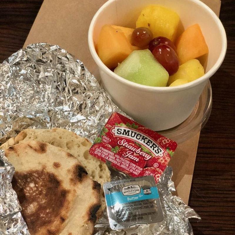 English muffin with butter and jelly, and a cup of fresh fruit