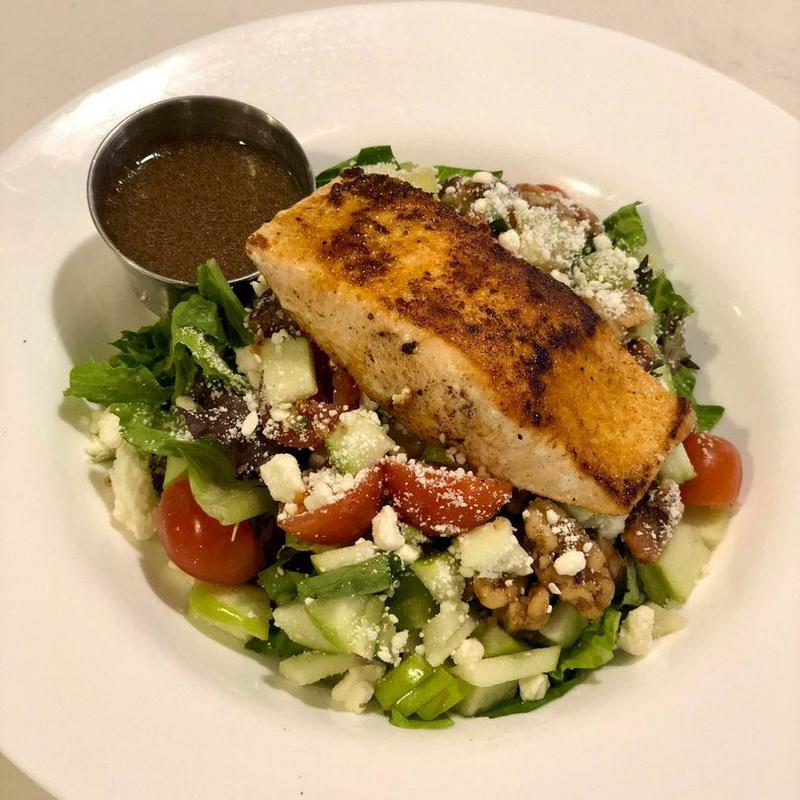 Shredded potatoes, red quinoa, spinach, and white cheddar topped with honey chipotle marinated mixed greens, cucumbers, cherry tomatoes, blackened salmon, and a caramelized lemon slice