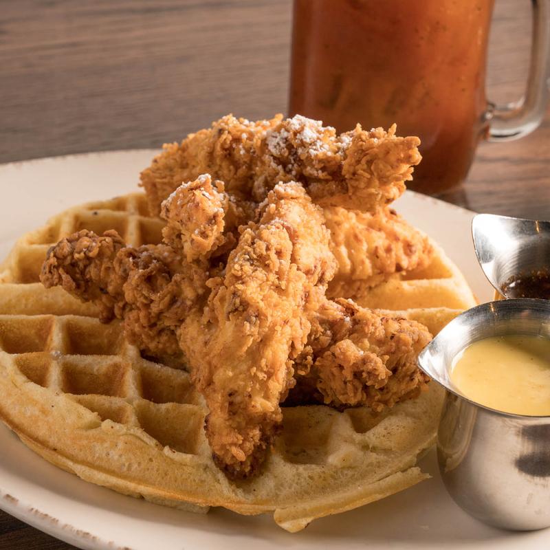 Buttermilk waffle topped with 4 fried chicken strips, served with spicy syrup and honey mustard